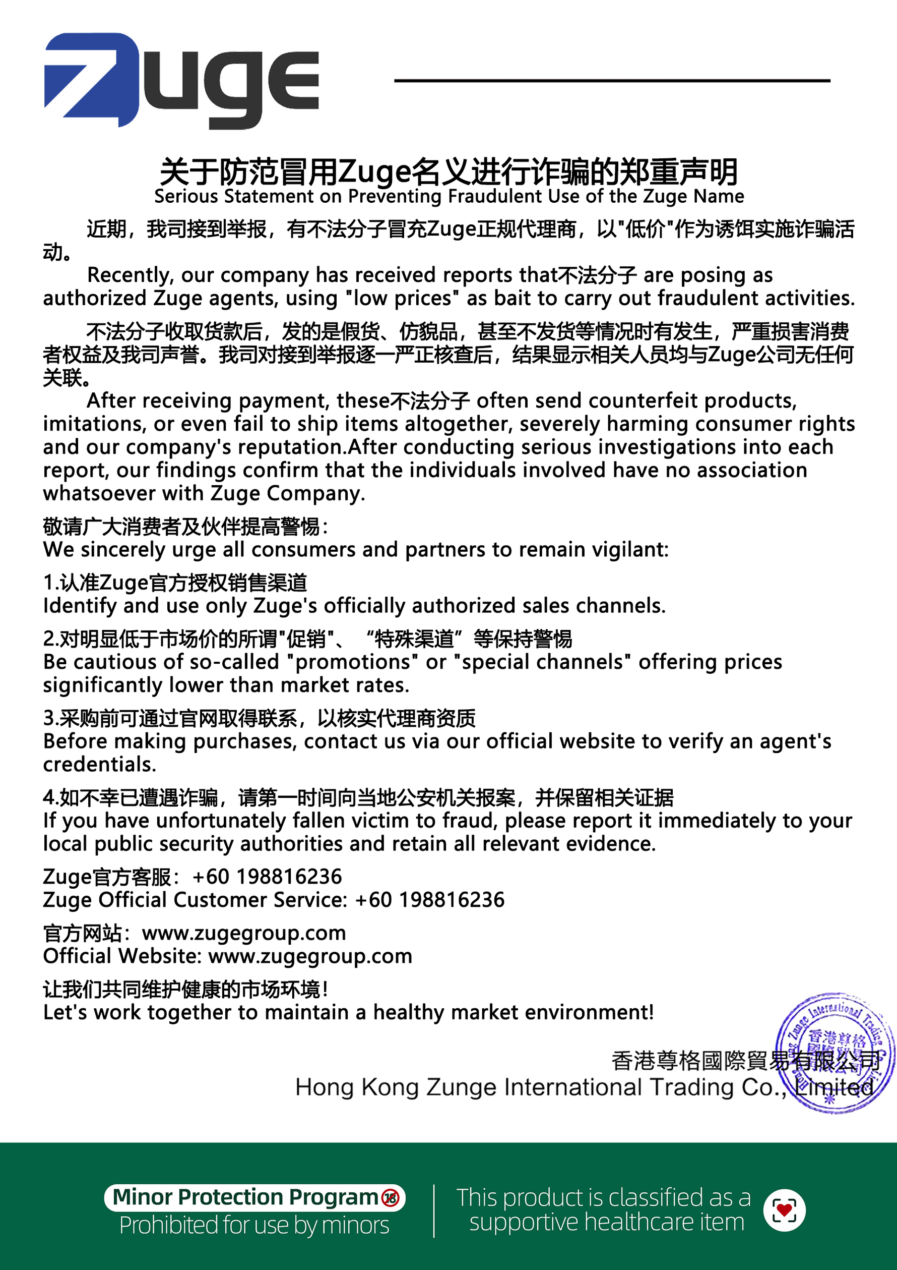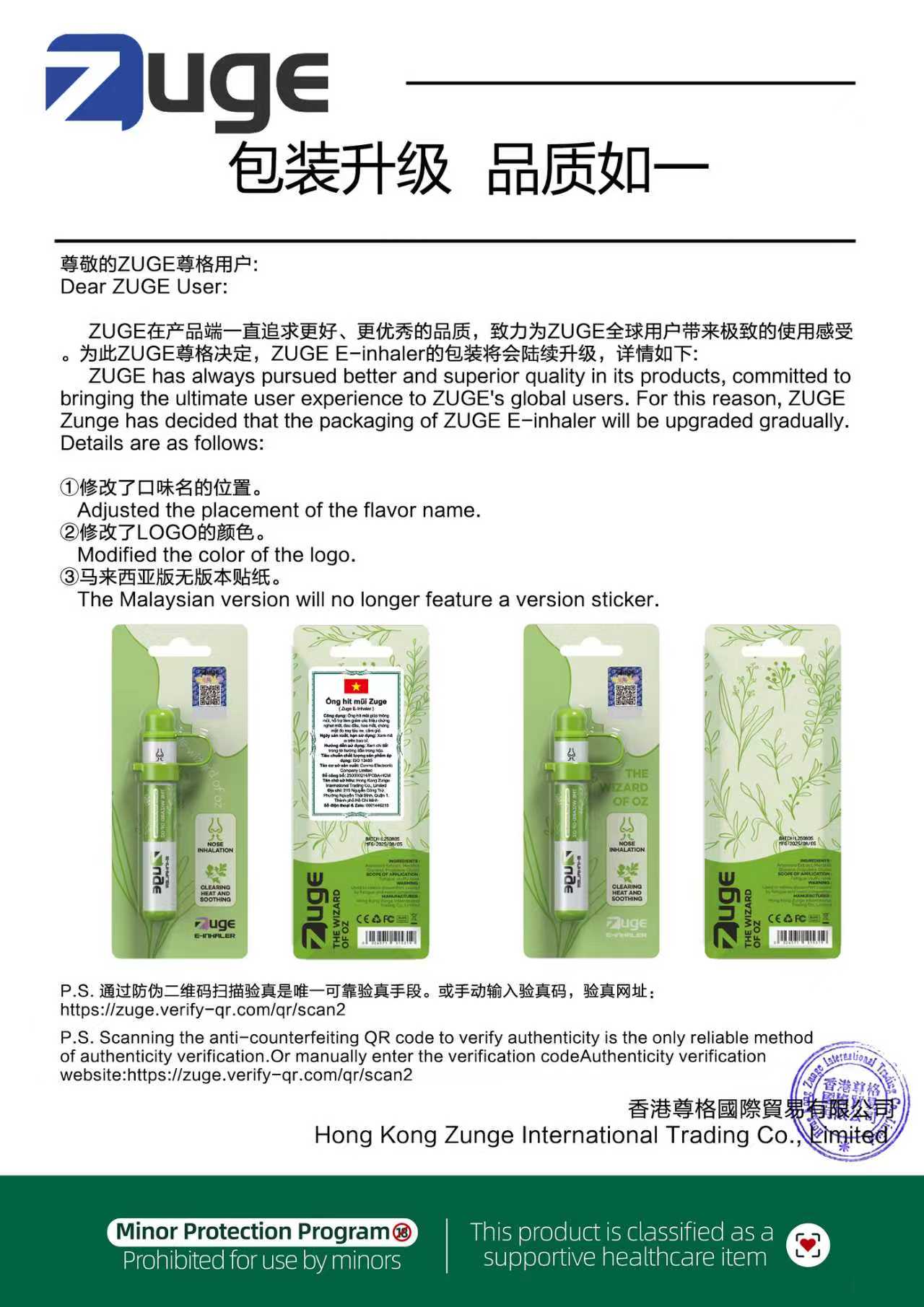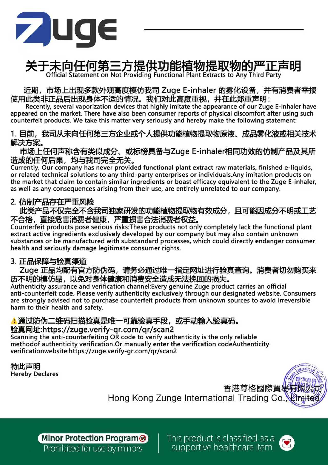 近期市场出现外观高度模仿Zuge E-inhaler的雾化设备,已有消费者使用后出现不适。Zuge目前从未向任何第三方提供功能植物提取物原液、成品或技术,仿制品可能造成的任何后果,与Zuge无关。请广大消费者认真甄别,避免上当、甚至承担健康风险。