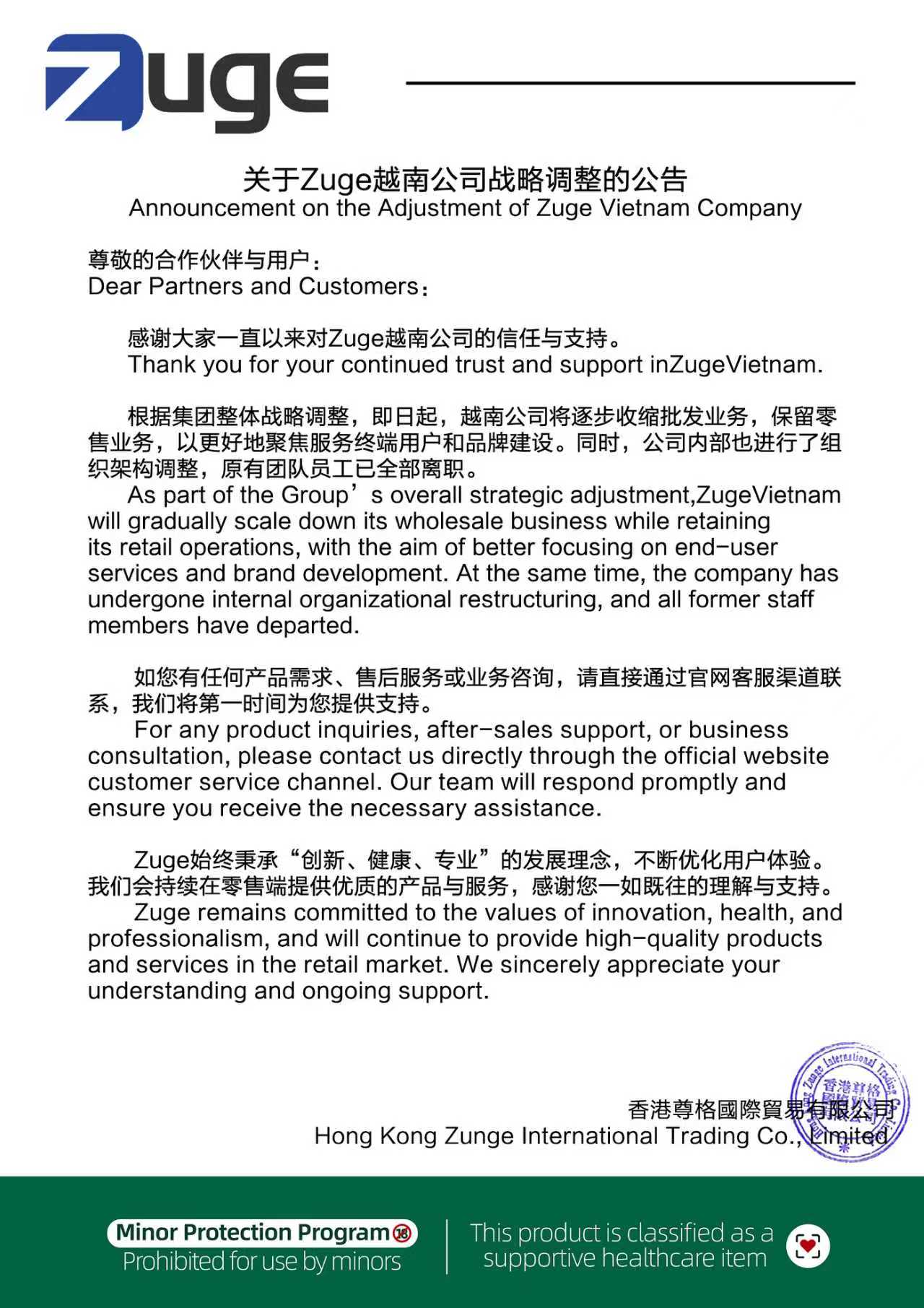 为优化战略布局,Zuge越南公司即日起将专注于零售业务与用户服务,原有批发业务逐步收缩。此次调整不影响越南地区产品与售后服务,您可通过官网联系我们,我们将继续为您提供专业支持。