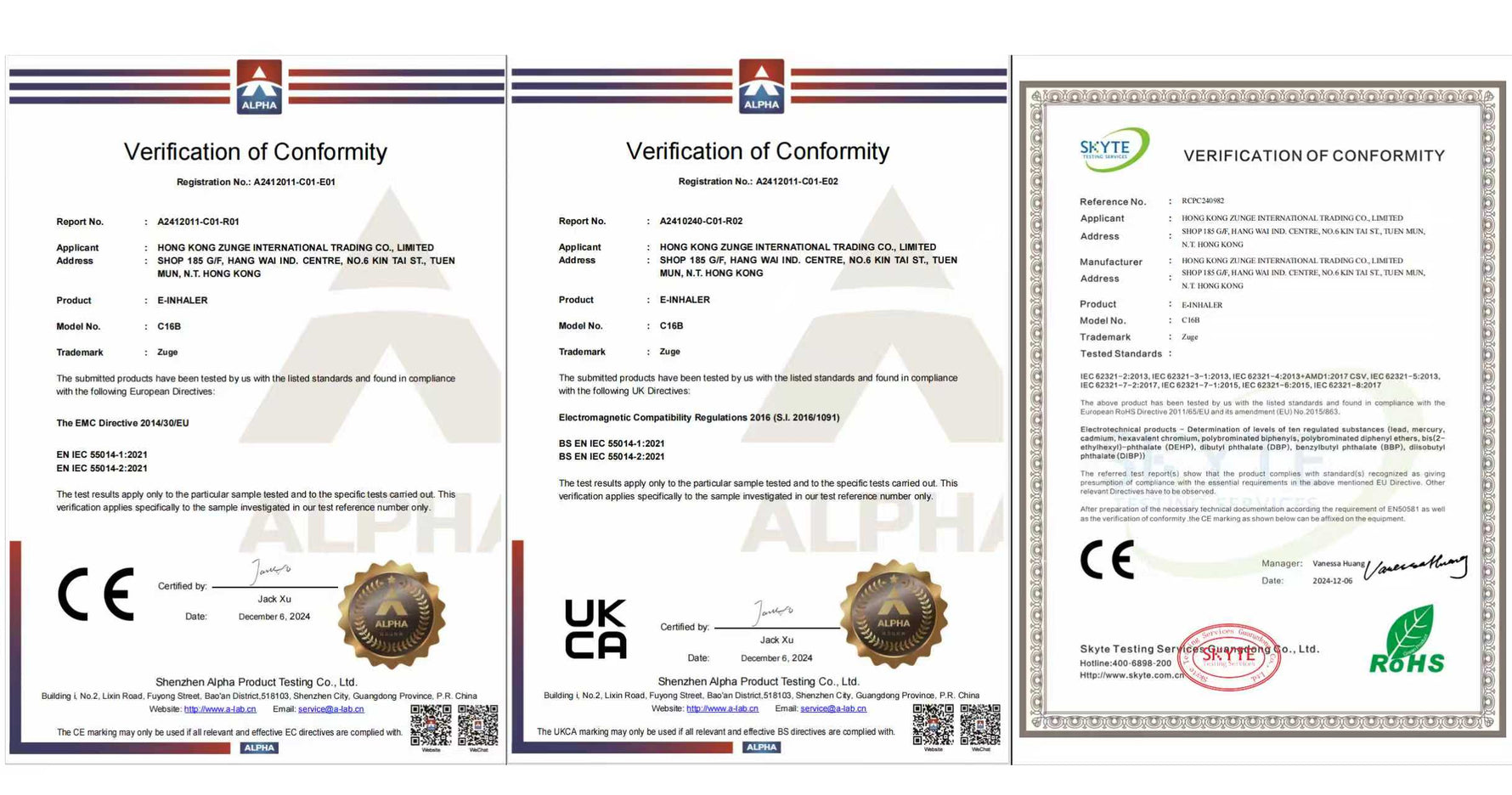 国际认证,我们将Zuge E-inhaler送至欧盟权威检测机构,通过了CE、UKCA、RoHS三重国际认证,以权威背书证实其卓越品质与全球合规性。CE与UKCA确保其安全性能完全满足欧盟与英国市场准入要求;RoHS则严格限定有害物质,践行环保承诺。这标志着产品在安全、品质与环保方面均达到国际标准。