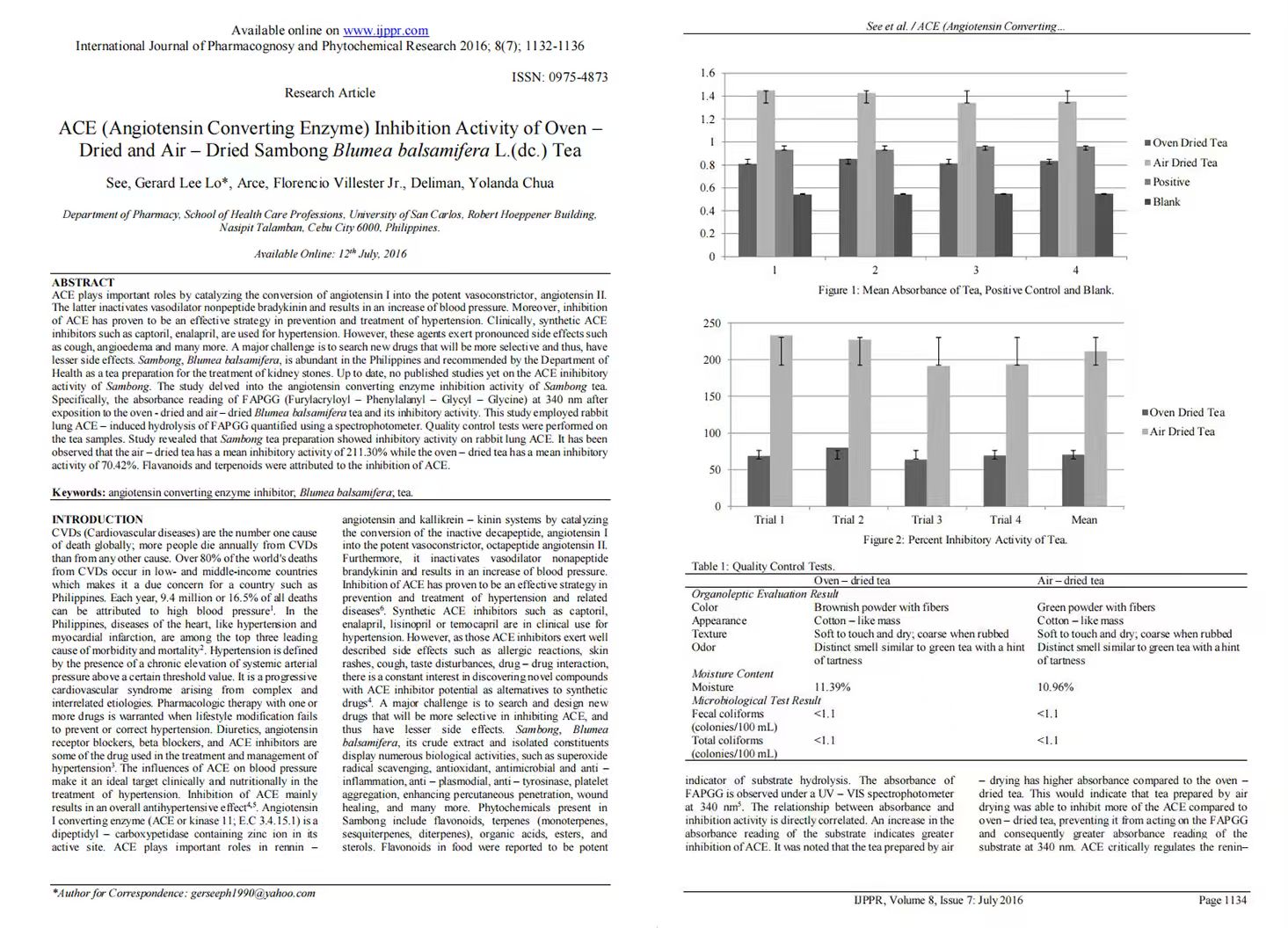 本研究由圣卡洛斯大学药学院发表,证实艾纳香(Blumea balsamifera)提取物对血管紧张素转化酶(ACE)具有显著抑制作用。实验显示,艾纳香其ACE抑制活性高达211.3%,其活性成分黄酮类与萜类化合物被认为是起效关键。该研究为艾纳香在舒缓方面的潜在健康益处提供了前沿的科学依据。